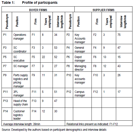 The unit of analysis for this study was the relationship between South African 3PL supplier and buyer firms. The unit of data collection encompassed managers from both 3PL suppliers and buyer firms. Fourteen participants from fourteen different firms consented to participate in the study. A relational link exists between six of the 3PL firms and six of the buyer firms in this study. The remaining two firms belong to the buyer category, with no relational link present in this study. Data saturation was achieved after 12 interviews resulting in no new themes being uncovered in the final two interviews. In studies consisting of homogenous participants, saturation may be achieved within the first 6 to 12 interviews (Mason 2010:78).