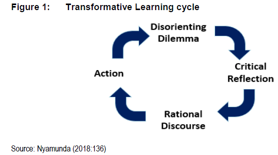 From Figure 1 it can be observed that transformative learning is a cycle, ongoing and tentative. A person never reaches a point where they are fully transformed (Nyamunda 2018:291; West 2014:167-168). Transformation is needed especially in the 4IR characterised by volatility, uncertainty, complexity and ambiguity (VUCA) (Kakouris 2015:15).