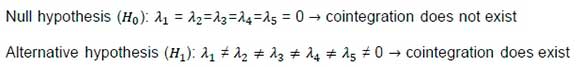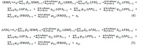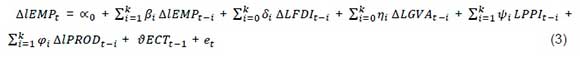 Where LEMP is the log of employment, LFDI is the log of foreign direct investment, LGVA is the log of gross value added, LPPI is the log of the producer price index and LPROD is the log of labour productivity. βi, δi, ni, Ψi and φtare the short-run coefficients to be estimated, while λ1 to λ5are long-run coefficients to be estimated and t denotes a specific period. Additionally, oc0and etrefer to the intercept and error term correspondingly. Following the model established in Equation 2, cointegration among variables was tested based on the subsequent hypothesis.