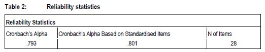 The measurement scale was assessed by examining its reliability and validity. Reliability measures the internal consistency of the latent internal indicator as indicated in Table 2. The researchers used Cronbach's alpha to measure the reliability of the variables. According to Fornell and Larcker (1981), the reliability coefficient assesses the consistency of the entire scale with a lower limit of 0.7. The covariance among the items had a Cronbach's alpha of 0.793. The Cronbach alpha coefficient based on standardised items had a value of 0.801, employing the correlations among the items. The alpha based on standardised items is based on the assumption that all items have equal variances. The two Cronbach's alpha coefficient values obtained satisfy the recommended reliability criterion, as they indicate an overall internal consistency among the 28 items. The researchers accepted the reliability of the data, which paved the way for further analysis.