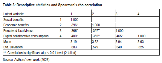 Descriptive statistical analysis involves assessing scores from each construct by evaluating averages, standard deviations, and correlations among all latent variables. The Spearman's rho correlation results summarise statistical significance at p <0.01 level for the latent variables: economic benefits, social benefits, and security assurance. Perceived usefulness serves as a moderator variable, while DCC functions as the behavioural intention variable, both demonstrating statistical significance. Table 3 summarises the descriptive statistics and Spearman's rho correlation.