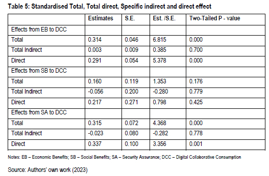 The results of the path analysis presented in Table 5 show standardised Total, Total direct, and indirect effects. The standardised covariance, i.e., correlations (r), are restricted to a standardised range of (-1 < r < 1) (Geiser, 2020). The standardised error for total and direct effect from economic benefits to DCC is 0.046 (z = 6.815) and 0.054 (z = 5.378), respectively. Therefore, the total and direct effect is significant (p < 0.000). Total indirect effects from economic benefits, social benefits and security assurance to DCC had insignificant results. The standardised error for total and direct effect from security assurance to DCC was 0.072 (z = 4.368) and 0.100 (z = 3.356), respectively. The total indirect effects of security assurance on DCC were insignificant. The effects of social benefits on DCC were all insignificant in terms of total, indirect, and direct effects. With reference to parameter estimates, all freely estimated factor loadings were significantly different from zero. As noted in this study, there is a gap between the attitudes of consumers and their behavioural intentions. The coefficient between attitudes variables in the model and DCC are relatively small compared to other studies.