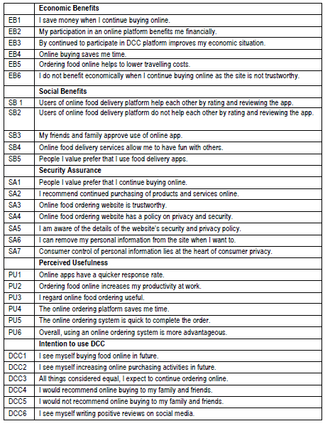 The purposive sampling method was used as only consumers who buy food online from the identified service providers were included in this study. A total of 827 valid responses were obtained and formed part of this study. The questionnaire (Appendix A) was developed using existing scales from previous studies, taking into account this study's research objectives (Malhotra, 2015). A questionnaire is a formalised set of questions used to obtain respondents' information (Malhotra, 2006). The questionnaire employed psychometric measurements (Nunnally, 1978). Each construct was measured with four to seven items on a five-point Likert scale ranging from 1 = Strongly Disagree to 5 = Strongly Agree, where 3 = Neutral. Scaling techniques varied in the questionnaire to allow for the greatest variety of statistical analyses (Malhotra, 2006). Churchill et al. (1996) and DeVellis et al. (2003) proposed a step-by-step psychometric procedure to be employed when designing questionnaires, and the researchers followed them. The technology acceptance model was instrumental in guiding the researcher on the choice of latent variables and has been widely used in consumer behaviour research.