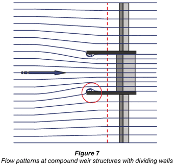 A series of individual weirs operating in parallel is created across the river in this way. Discharge over the individual crests can be rated with the established discharge formulae for a single crest weir if stage is recorded between the dividing walls upstream of each weir section. With a compound weir, it is usually not economical to measure water levels upstream of each individual weir section (Ackers et al., 1978). If water levels are measured only at a single section of a compound weir, the total head is assumed constant over the full width of the weir. The total head across the compound structure is calculated at the individual weir section where the water level is recorded.