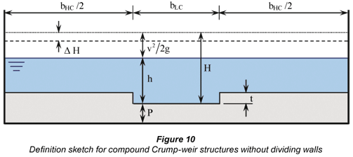 Discharge over a compound Crump weir without dividing walls, assuming a horizontal water surface and total energy head across the entire weir, is calculated as follows (ignoring the energy losses at the weir crest):