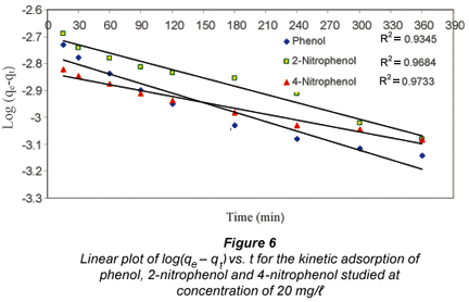 A plot of log(qe q) vs. time should give a straight line to confirm the applicability of the kinetic model, and a derivation of the constant. Figure 6 shows a plot of log(qe qt) vs. t for the phenol, 2-nitrophenol and 4-nitrophenol adsorption at a concentration of 20 mg/ℓ.