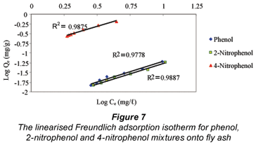 The correlation coefficient values determined for each of the adsorption isotherms indicates that the Freundlich model effectively fits the experimental data better than the Langmuir model. The value for n was found to be greater than 1 for the fly ash, which suggested unfavourable uptake of the adsorbates by the fly ash. The adsorption capacity for phenol, 2-nitrophenol and 4-nitrophenol at the maximum residual concentration was calculated using the Freundlich constants (Kf and 1/n) at an initial concentration of 20 mg/ℓ for all the adsorbates and the values obtained were 5.79 x 10-2 mg/g, 5.47 x 10-2 mg/g and 6.33 x 10-2 mg/g for phenol, 2-nitrophenol and 4-nitrophenol, respectively. The adsorption capacity for the adsorbates when applying the Langmuir constant under the same conditions and at the maximum residual concentration were found to be 4.37 x 10-2 mg/g, 4.76 x 10-2 mg/g and 5.62 x 10-2 mg/g. The Kf value determined for fly ash on the adsorption of phenol from the solution was found to be higher than that of 2-nitrophenol and lower when compared to 4-nitrophenol within the same concentration ranges studied.