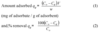 Data obtained from the adsorption isotherm tests were used to determine the adsorption capacity of the fly ash. The equilibrium adsorption uptake and percentage removal of phenol from the aqueous solution qe (mg/g) was determined using the following relationship: