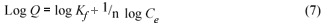 The Freundlich isotherm predicts that the adsorbate concentration on the surface of an adsorbent will increase when there is an increase in the initial adsorbate concentration in the aqueous solution. The experimental data obtained are plotted as log Qe versus log Ce , to obtain the constants Kf and 1/n. The constant Kf is a comparative measure of the adsorption capacity of the adsorbent, while n is an empirical constant. The magnitude of n gives an indication of the favourability of adsorbent/adsorbate system. Values of n >1 signify that the solute has a low affinity for the adsorbent at low concentrations. Likewise, a value of n < 1 is an indication of favourable adsorption and a high affinity between the solute and the solid phase.