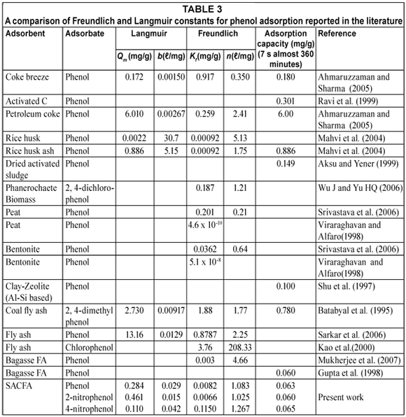 The adsorption results from this study were compared to those previously found by other authors in Table 3. The value of Kf was found to be significantly higher for the phenol-SACFA system in comparison to phenol-rice husk and phenol-coke breeze described by Mahvi et al. (2004). Also, the constant Kf value obtained for this system was in contrast to the result reported by Viraraghavan and Alfaro (1998) for phenol-bentonite and phenol-peat systems. The adsorption capacity for phenol varies widely among the different adsorbents, thus again underlining the necessity and importance to characterise and investigate each adsorbent intended for pilot or plant use.