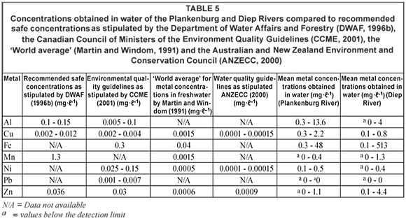 The highest mean metal concentrations in water samples were recorded for Al, Fe and Zn at Site A (industrial area) in the Diep River, which exceeded the guidelines stipulated by DWAF, the CCME, ANZECC and the 'world average', and for Fe and Zn, the baseline values of Micó et al. (2007)