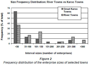 The size of the enterprise assemblages of both river towns and Karoo towns ranged from villages to large towns. Some river villages had only 8 enterprises and some Karoo villages only 15 enterprises (Table 4). A large river town, Upington, had 906 and a large Karoo town, Beaufort-West, had 353 enterprises.