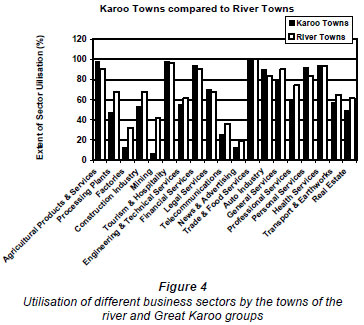 The 2 groups (of similar size: 30 river towns and 30 Karoo towns) and each spanning the range from small villages to large towns were, where appropriate, analysed separately as well as in combination (referred to as the super-group). Several elements of the enterprise structures of towns can be used in such comparisons, i.e:
