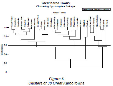 The larger group in the river towns consists of 2 clusters (at r = 0.6 level), the one having 9 member towns and the other having 13 (Fig. 5). The smaller group have 3 clusters (defined at r = 0.6), 2 clusters containing 2 towns and the other containing 4 towns (Fig. 5). The larger group in the Great Karoo towns consists of 3 clusters (at r = 0.6 level); one having 12 member towns, the second having 10 member towns and the last having only 2 member towns (Fig. 6). The smaller group of Great Karoo towns have a single cluster (defined at r = 0.6) and a single outlier (Fig. 6).