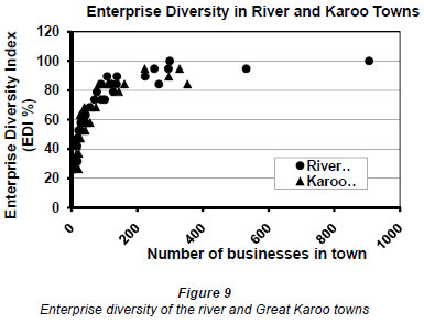 This study measured enterprise diversity for a specific town simply as the number of enterprise sectors that have at least one enterprise each. An Enterprise Diversity Index (EDI) was calculated for each town as the number of sectors with representatives as a percentage of the 19 sectors used in the study. The EDIs for the river and Karoo towns were compared.