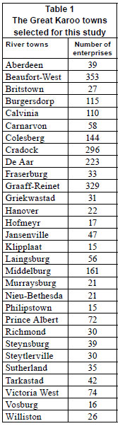 The selected towns are mostly situated in the heartland of South Africa, a mostly arid area. The Orange River passes through this area before reaching the Atlantic Ocean at Alexander Bay. The Karoo biome is mostly suitable only for stock production (Cowling, 1986) and associated products such as wool and mohair. However, the presence of significant rivers in the arid region creates additional agricultural possibilities such as irrigation farming. The question is if this would have significant effects on enterprise development in the towns of the region?