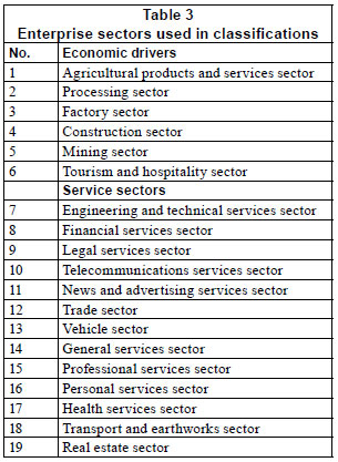 The rapid method to determine the formal enterprise assemblages of South African towns drew upon ecological experiences in the study of biotic assemblages of aquatic ecosystems (Toerien and Seaman, 2010). It is based on listings of enterprises in telephone directories. All enterprises listed in such directories form part of the formal economy of the towns in which they reside and their enumeration allows valid comparisons between towns (Toerien and Seaman, 2010). Telephone directories of the selected towns were scrutinised (Tables 1 and 2) and all enterprises were listed in spreadsheets and categorised using 19 major enterprise sectors, which included economic drivers and service providers (Table 3). When it was impossible to deduce the nature of an enterprise from its name in the telephone directory and/or from an internet search, the entry was not used in subsequent analyses. The identified enterprises in every enterprise sector of each town were counted to develop an enterprise assemblage profile for each town of every selected group.