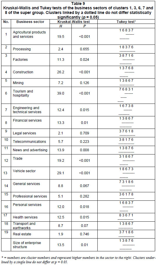 Statistical comparisons consisting of Kruskal-Wallis and Tukey tests of Clusters 1, 3, 6, 7 and 8 are summarised in Table 9. Eight sectors, namely, processing, mining, legal services, telecommunication services, general services, professional services, transport and earthworks, and real estate services did not have any significant differences between clusters according to the Tukey test (Table 9). The other 11 sectors had one or more significant differences. The tourism and hospitality sector and the vehicle sector had the most (5) significant differences between clusters. Figure 8 provides a visualisation of the differences between clusters. Due to space limitations, the rest of the graphs are not shown but they confirm the results of the statistical analyses.