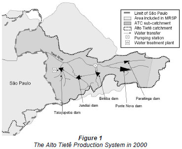 The study focussed on the 919 km2 catchment area of the Alto Tietê production system, which is a good example of the struggle between water quantity and quality for urban supply. This system produces 10 m3/s (to be increased to 15m3/s by 2015). Its construction started in 1972 with the Ponte Nova reservoir, originally built for flood protection. Between 1976 and 2006, 4 additional reservoirs were built, filled and connected to the Ponte Nova reservoir to satisfy increasing demand for water for São Paulo. The Alto Tietê production system does not only supply the MRSP demand for water. Its manager (DAEE, Department of Water and Electrical Energy) also has to deal with local demand. Three municipalities have independent water services and together consume 0.47 m3/s. The demand from local industries is high at 4.96 m3/s (Suplicy, 2002). The sub-catchment is also characterised by intensive irrigated agriculture that consumes an average of 2.13 m3/s per year (81% of MRSP irrigated area is located in the ATC sub-catchment). The Tietê flow is also used to dilute downstream effluents from the metropolis and consequently a minimal flow has to be preserved at the catchment exit.
