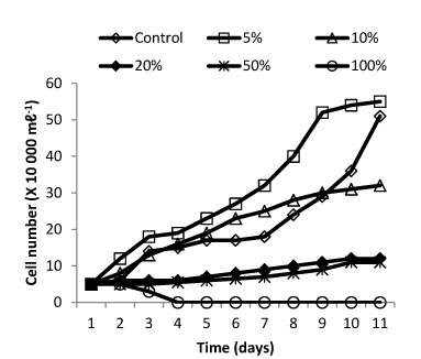 Growth of Arthrospira in a dilution range of untreated tannery effluent and in Zarrouk's defined mineral medium (control), measured by cell count.