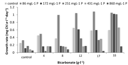 Growth performance of Arthrospira (mg-ℓ-1 Chl a) in a 5% dilution of untreated tannery effluent comparing increasing concentrations of bicarbonate and phosphate and with 5% untreated tannery effluent as the control.