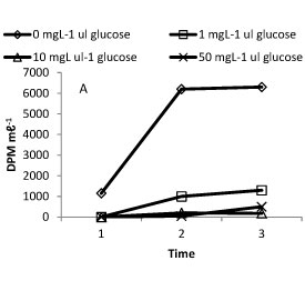 Uptake of D-fXJ-glucose (degradations/ minute) by Arthrospira incubated in the light in defined medium, without the addition of unlabelled glucose and also with the addition of increasing concentrations of unlabelled glucose at Time 1 = 5 min, Time 2 = 3 h and Time 3 = 6 h.