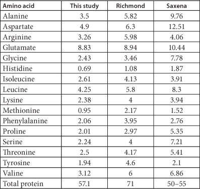 Amino acid composition of sundried Arthrospira biomass harvested from the tannery WSP and compared with results reported by Richmond (1986) and Saxena et al. (1983) (g amino acid- 16 g N1)