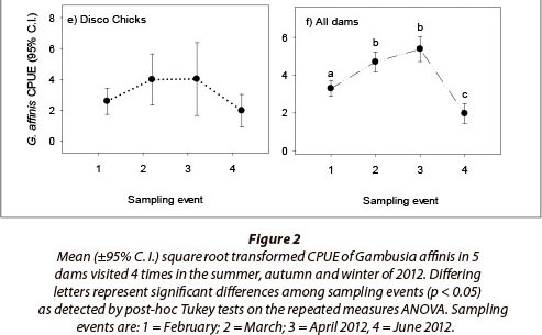 A repeated-measures ANOVA was used to test the differences in G. affinis CPUE between dams and over sequential sampling events, to assess whether or not a 'boom-bust' pattern of rapid population growth and subsequent decline occurred in each of the five sampled populations. CPUE of G. affinis were square-root transformed to meet ANOVA assumptions of normality and homoscedasticity. Significant differences in CPUE between individual sampling events were then examined using post hoc Tukey tests. The analyses were conducted using the statistical package, Statistica 10.
