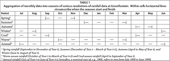 Rainfall data were analysed at a range of resolutions compris-ing monthly, seasonal (4 divisions (spring, summer, autumn, winter) and 2 divisions (warm, cool)), and annual (TABLE 1). Seasonal and annual periods were defined on account of their relation to plant growth.