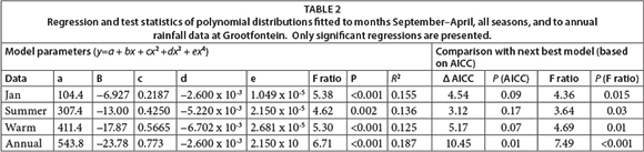 Significant trends over time, explaining between 13 and 19% of the variation, were evident for January, 'summer', 'warm sea-son' , and 'annual' (Figure 2). In all cases 4th order polynomial models best described the trends (TABLE 2). The most general pattern that emerges is a 'W' shape, where rainfall was high during the late 1800s (annual average = 459 mm from 1889 to 1898), low for the first third of the century (annual average of 319 mm from 1899-1937), rose slightly in the middle of the century (annual average of 401 mm from 1938-1952), dipped until the mid-1980s (annual average of 353 mm from 1953-1984), and rose again until present day (annual average of 426 mm from 1985-2010) (Figure 2). The month of January appears to be important in determining wet years, and this in turn contributes to high totals for 'summer', 'warm', and 'annual' seasons. Of the 20 highest totals for January, 14 (70%) occurred either during the 1890s or since 1985.