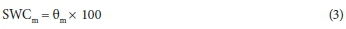 where: Mw is the mass of the moist soil plus the can, Md is the oven-dry mass of the soil plus the can and Mcis the metal can mass. Mass percentage soil water content (SWCm) was calculated as follows:
