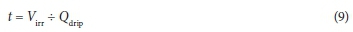 where Virr is the volume of water required per pot (mL) and Mact is the actual pot plus soil mass before irrigation (g). The time required to apply Vp was calculated as follows: