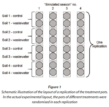Treatments were applied over 4 simulated irrigation seasons. Each season consisted of 6 irrigations, which was estimated as the number of irrigations a vineyard would require during the harvest period, i.e., when the highest volumes of wastewater are produced. Hence, a total of 24 irrigations were applied over the 4 simulated irrigation seasons. Each soil/water treatment combination was replicated 3 times in a complete randomised block design. Following each simulated season, i.e., after 6, 12, 18 and 24 irrigations, the soil chemical status was determined to compare the effect of irrigation with diluted winery wastewater to that of municipal water. Since soil sampling was destructive, a replication 'plot' of each soil/water treatment combination consisted of 4 pots (Fig. 1). At the end of each simulated season, one of the four pots was removed for sampling.