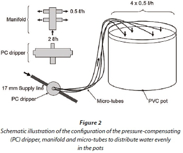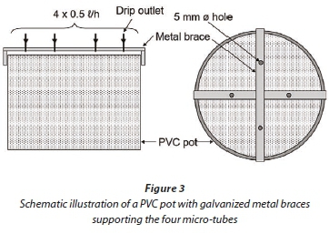 Two 0.74 kW, 3 m3/h pumps (Foras, Berg River Irrigation, Paarl) were used to apply the municipal and diluted winery wastewater to the respective soil/water treatment combinations. The municipal and diluted winery wastewater passed through two 130 μm ring filters (Arkal, Netafim, Kraaifontein) installed downstream of each pump. An 8-way manifold with a ball valve at each outlet allowed individual irrigation of 8 soil/ water treatment combinations. Water was distributed through a network consisting of 17 mm 0 laterals, and applied to each pot by means of a 2 L/h pressure compensating button dripper with a 4-way manifold attached to it (Netafim, Kraaifontein). Four 700 mm long, 3 mm inner 0 micro-tubes were attached to each dripper manifold (Fig. 2). In order to obtain equal flow through the four micro-tubes, an inline labyrinth-type dripper (Arrow, Netafim, Kraaifontein) was inserted in the open end of each micro-tube to create some back pressure. To distribute the irrigation water uniformly over the soil surface, the four micro-tubes were supported by a brace placed onto each pot (Fig. 3). The brace, in the form of a cross, was made from two 1.8 mm x 7 mm x 205 mm galvanised metal strips. On each side of the metal strips, the last 20 mm was bent at a rectangle so that the brace fitted firmly onto a pot. The four micro-tubes were pushed through 5 mm 0 holes drilled in the brace. The flow rate through each of the four micro-tubes was 0.5 L/h. The total flow rate through the four micro-tubes (Qdrip) was 34 mL/min.