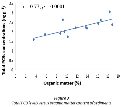 PCBs are known to sorb to organic matter and sediment grains and this can be used to explain the distribution of PCBs in sediments. The analysis showed that a positive correlation exists between sediment organic matter and total PCB concentrations in sediment samples (Fig. 3) (p < 0.05). There was no correlation of contaminant content to particle fraction (sand and clay). However, there was a significant correlation with silt fraction (r = 0.35, p < 0.05).