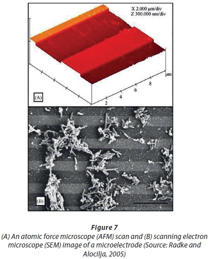 Certain important characteristics of electrochemical biosensors include bioelectroanalysis, the selection of a bioreceptor that is specific to the target analyte, the correct immobilisation method and transducer selection (Koyun et al., 2012). A bioelectrochemical reaction occurs between the bioreceptor and analyte, which may cause a change in current, potential or resistivity between electrodes (Koyun et al., 2012), depending on the geometry and design of the sensor. The performance of the sensor is dependent on the electrode material (electrode and transducer), the surface modification of the electrode and the geometrical dimensions, all of which influence detection ability (Sadana, 2006). Sensor arrays can be integrated with integrated circuits to form microsystems that are able to detect multiple analytes on the same chip (Kim et al., 2003). This enhances the compatibility of the sensors, makes it more functional and can lead to increases in sensitivity (Koyun et al., 2012).