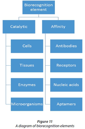 The main biorecognition elements are listed in Figure 11 and a diagram of the transducer types, methods and signals are shown in Figure 12. The elements and their interaction are critical in the design of biosensors.