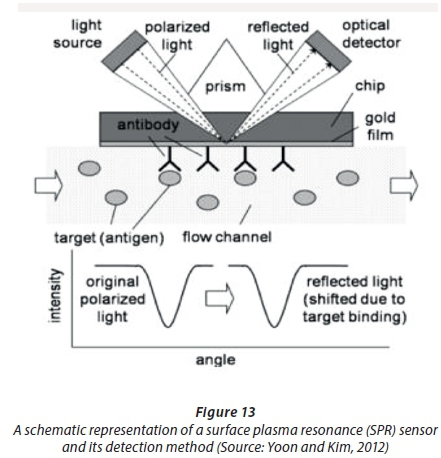 Another interesting optical sensing mechanism is the use of surface plasmon resonance (SPR), as can be seen in Figure 13.
