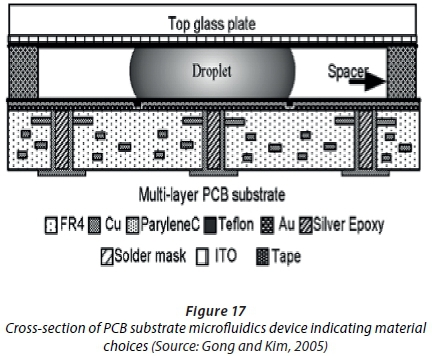 Gong and Kim (2005) demonstrated control of droplet volumes on multilayer printed circuit boards (PCBs) with through-substrate electrical contacts to eliminate side connecting lines. They also developed a microfluidic system on a PCB (Gong and Kim, 2008). A cross-section of the device can be seen in Figure 17 (Gong and Kim, 2005).