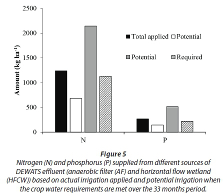 The amount of nutrients that could have been supplied if crops were irrigated with effluent from the HFCW or the AF based on crop water requirements are shown in Fig. 5. The results show that if HFCW effluent was used, half of the nutrients required will be supplied (683 kg-ha-1 N and 145 kg-ha-1 P). If AF effluent were to be used exclusively, the amounts supplied will be much greater than required (2 144 kg-ha-1 N and 514 kg-ha-1 P).