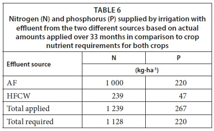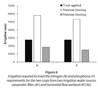 Scenarios to determine the irrigation requirements if effluent from different sources (HFCW and AF) were to be used to meet crop N and P requirements are shown in Fig. 6. To meet nutrients required by the two test crops, 5 824 mm (HFCW) and 1 849 mm (AF) will be required for N and 5 327 mm (HFCW) and 1 507 mm (AF) for P.