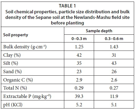 Before planting, soil samples were collected from 3 different layers (0-0.3 m and 0.3-0.6 m) and characterised for their physical properties (Table 1). Bulk density was determined from undisturbed soil cores. Particle size distribution was done using the hydrometer method and the soil texture classified according to Soil Classification Working Group (1991). Five soil samples were collected from 2 depths (0-0.3 and 0.3-0.6 m) randomly within each plot (90 m2) and bulked to make a composite sample. The samples were sent to Soil Fertility and Analytical Services Division (Department of Agriculture, Cedara) for chemical analysis according to standard methods of the Non-Affiliated Soil Analysis Work Committee (1990).