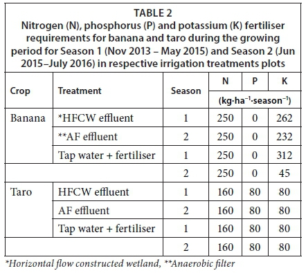 Tissue-cultured banana seedlings were purchased from Zululand Nurseries, Eshowe, KwaZulu-Natal, and taro seed (Dumbe lomfula) was obtained from Ukulinga, University of KwaZulu-Natal Agricultural Research Farm. The two crops were selected due to the ability of the banana to bear fruits which are high above the ground and hence less likely to be contaminated by the effluent while taro is a crop that is commonly grown in South Africa and must be cooked before eating. Crops were planted on 13 November 2013 at a spacing of 3 m χ 1.5 m (banana) and 1 m x 1 m intercrop (taro). The plots were 10 m χ 9 m (90 m2) with 20 banana and 42 taro plants. Fertiliser was applied to the tap water + fertiliser-treated main crop based on soil chemical analysis results shown in Table 2. Fertiliser was not applied to taro although it required the amounts shown in Table 2 and was expected to benefit from the main crop in an intercrop. Split application of urea (46% N) was done for 8 months and KCl (52% K) was done at 3-monthly intervals. The soil P test was greater than the target soil test (39.3 mg-Lhence P fertiliser was not applied.