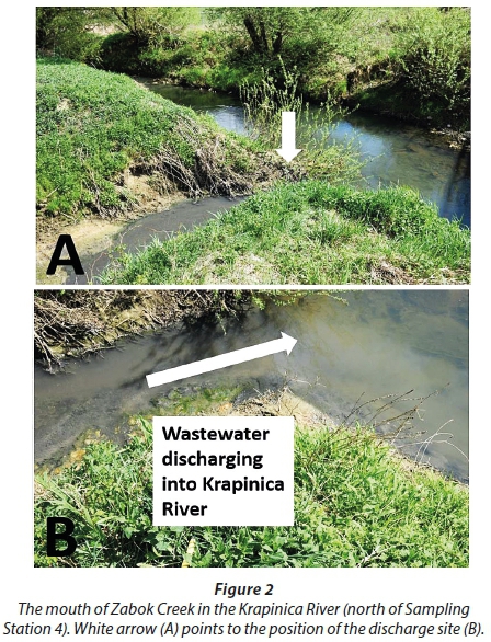The examined area of the Krapinica and Krapina Rivers is shown in Fig. 1. Stations 1−3 represent the flow of Krapinica River, while Stations 4 and 5 were chosen to examine the separate input of urban (Zabok creek, Fig. 2) and hospital wastewater (Krapina River) on the ecosystem. In total, 5 samples of water and 5 samples of corresponding sediment were collected along the Krapinica and Krapina Rivers (Table 1). It is very common and constant in this region of Croatia to have untreated sewage released directly into the riverine ecosystem. Based on the distribution of settlements, all sampling locations were in the proximity of untreated sewage release points. Raw wastewaters entering the river consist of domestic wastewaters at Station 1, but at Stations 2-5, in addition the wastewaters from different human and animal healthcare centres (primary care and veterinary stations, rehabilitation and general hospital) are discharged.