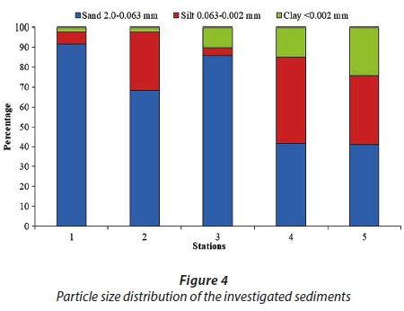 River sediments from 5 sampling locations were analysed. Samples from Stations 1, 2 and 3 are composed dominantly of sand sized particles and represent sand, sandy loam and loamy sand, respectively (Fig. 4, Soil Science Division Staff, 2017). Samples from Stations 4 and 5 contain a higher amount of silt and clay than sand sized particles and represent loams (Fig. 4). Higher content of silt and clay fraction is accompanied by higher LOI, content of Al2O3, Fe2O3, MgO, Na2O, K2O and TiO2, but lower content of SiO2 as compared to sand-enriched samples (Table 2). Samples containing a higher content of silt and clay fraction are also enriched in As, Ba, Cd, Co, Cs, Cu, Hg, Mo, Ni, Pb, Ta, U, V and Zn (Table 3). This indicates that silt and clay fractions of analysed sediments are probably the main scavengers of heavy metals (Salomons and Förstner, 1984). Analyses of < 2 mm and < 2 µm fractions showed that all samples are composed of quartz as the predominant mineral phase, following calcite, dolomite, plagioclase, K-feldspar, goethite, micaceous clay minerals (mica and illitic material), kaolinites, mixed-layer clay minerals, while 14 Ǻ clay minerals (smectite and/or vermiculite) and XRD-amorphous compounds are detected only in the clay fraction of Samples 3−5. Although the decrease in particle size of downstream sediments is a natural phenomenon, the increased LOI, heavy metal concentration and both 14 Ǻ clay minerals and amorphous matter contents suggest that Sediment Samples 4 and 5 are under high anthropogenic pressure.