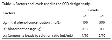 A three factor, face centred, central composite design (FC-CCD) was applied to investigate the influence of the effective factors (initial phenol concentration (X1), biosorbent dosage (X2) and composite beads to solution ratio (X3)) on the biosorption capacity. CCD is one of the frequently used response surface methodology (RSM) designs (Aksoy and Sagol, 2016); this method helps to optimize the considered parameters using a minimum number of experiments, and also to examine the effect of individual and interactions of input parameters (Mukherjee et al., 2018). A total of 16 experiments were used, including 8 (23) factorial points, 6 (2 x 3) axial points and one triplicate at the centre point. For statistical calculations, the highest, lowest and central values of the independent variables were coded as +1, -1 and 0, respectively, according to the following relationship: