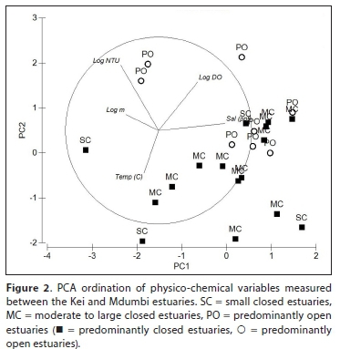 The PCA classification (Fig. 2) divided the estuaries based on salinity (Axis 1) and depth, temperature and turbidity (Axis 2). The first two axes accounted for approximately 64% of the variation between the samples. Large predominantly open systems (Mbhashe, Mtata, Qhorha) were situated towards the upper right section of the plot associated with high turbidities, depth and dissolved oxygen (Fig. 2). The predominantly open Qhorha, Ngqusi/Inxaxo, Shixini, Khobonqaba, Xhorha and Mdumbi were situated towards the middle right associated with high salinities and low turbidities. The predominantly closed estuaries showed a gradation from estuaries with low salinities to estuaries with high salinities situated towards the right of the plot (Fig. 2). Although there was overlap between estuary types, the marine-dominated predominantly open estuaries were all situated towards the right of the plot. The ANOSIM test revealed a weak but significant difference between estuary types (Global R: 0.25; p < 0.05). Pairwise tests showed that there was no significant difference between small predominantly closed estuaries and moderate to large predominantly closed estuaries (R: 0.26; p > 0.05), however, significant differences were observed between predominantly open estuaries and both small and moderate to large predominantly closed estuaries (R: 0.24-0.35; p > 0.05).
