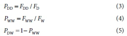 where, PD is the probability of the pentad being dry, PW is the probability of the pentad being wet, N is the number of years of data, FDis the number of dry pentads, FWis the number of wet pentads, PDD is the probability of a dry pentad preceded by a dry pentad, PWW is the probability of a wet pentad preceded by a wet pentad, PDW is the probability of a dry pentad preceded by a wet pentad, FDDis the number of dry pentads preceded by another dry pentad, FWWis the number of wet pentads preceded by another wet pentad, 2D is the probability of 2 consecutive dry pentads starting with a particular pentad, 2W is the probability of 2 consecutive wet pentads starting with the pentad, 3D is the probability of 3 consecutive dry pentads starting with the pentad, 3W is the probability of 3 consecutive wet pentads starting with the pentad, PDp1 is the probability of the pentad being dry (first pentad), PDDp2is the probability of the second pentad being dry, given the preceding pentad dry, PDDp3is the probability of the third pentad being dry, given the preceding pentad dry, PWp1is the probability of the pentad being wet (first pentad), PWWp2 is the probability of the second pentad being wet, given the preceding pentad wet, and PWWp3 is the probability of the third pentad being wet, given the preceding pentad wet.
