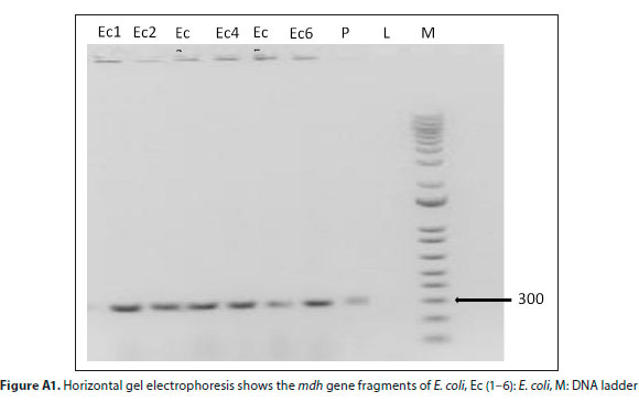 Colony PCR was performed on the bacterial isolates for the molecular confirmation of isolated E. coli in a Bioer XP thermal cycler in a total reaction volume of 25 μL. Each reaction contained 12.5 μL2x Biolabs PCR master mix (containing DNA polymerase, PCR buffer and dNTPs), 2 μL 0.5 mM of the mdh forward (GGTATGGATCGTTCCGACCT) and reverse (GGCAGAATGGTAACACCAGAGT) primers (Omar and Barnard, 2010), 2 |L template DNA and PCR grade water to a volume of 25 μL. The mdh gene was amplified following modified Tarr et al. (2002) PCR conditions: initial denaturation step at 95°C for 15 min, followed by a 30-cycle reaction (consisting of denaturing at 95°C for 45 s, annealing at 65°C for 1 min 5 s, extension at 72°C for 2 min) and final elongation at 72°C for 5 min. The PCR amplicon was resolved on ethidium bromide-stained horizontal agarose gel (1.5 %, w/v) and electrophoresis was allowed to run for 1 h in electric field strength of 100 V using 1x TAE buffer (40 mM Tris, 20 mM acetic acid, 1 mM EDTA). The gel was visualized under UV light (BioRad, USA). The relative sizes of the DNA fragments were compared with molecular 100 bp marker run with the amplicons.
