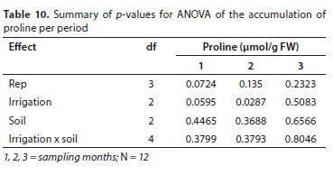 The obtained results are comparable to those reported by Mabizela (2020) on proline contents of C. subternata, where proline concentration increased massively in stressed treatments, increased slightly in semi-stressed plants, and was constant in control treatments. Higher proline content were also reported in wheat, Amaranthus species and Achillea species after being subjected to water stress (Keyvan, 2010; Slabbert and Krüger, 2014; Gharibi et al., 2016). Low proline content in plants indicates minimum water stress, and vice-versa. The high and significant levels of proline that were observed between treatments during the third sampling period may be attributed to the plants having reached the reproductive stage and having started flowering. Proline can accumulate in plants under both stress and non-stress conditions, although it is produced at low levels in all tissues in unstressed conditions (Kavi Kishor et al., 2015). As a metabolite and signal molecule, proline plays a crucial role in the synthesis of protein and the response of plant cells to environmental stresses (Mattioli et al., 2009). Proline levels may increase during wounding and pathogen attack in some tissues, different stages of plant growth and development, nodule formation, fertilization, cytokinesis, apoptosis, senescence, and cell wall lignification. Under normal physiological (un-stressed) conditions, plants accumulate high amounts of proline during the transition to flower initiation (Kavi Kishor et al., 2015), thus suggesting that proline may have a role to play in flower initiation and its subsequent development. Soil type did not have any significant effect (p > 0.05) on the proline contents of the plants (Table 9). A summary of p-values for ANOVAs of the accumulation of proline per month is presented in Table 10.